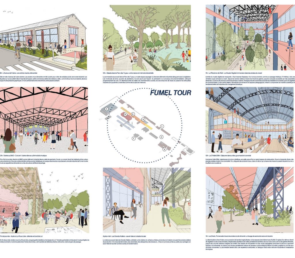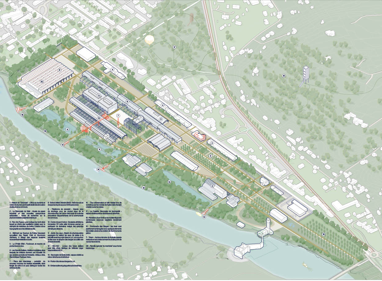 À l’ombre des anciens hangars, des ateliers vélo s’ouvrent pour rénover, réparer, transmettre des savoirs mécaniques simples mais essentiels. Un food-court s’installe dans la Halle Eiffel, proposant aux visiteurs les produits des agriculteurs de la région. Une capitainerie et un débarcadère permettent aux touristes de s’arrêter à Fumel au cours de leur croisière sur Lot et de découvrir la nouvelle ville-usine.