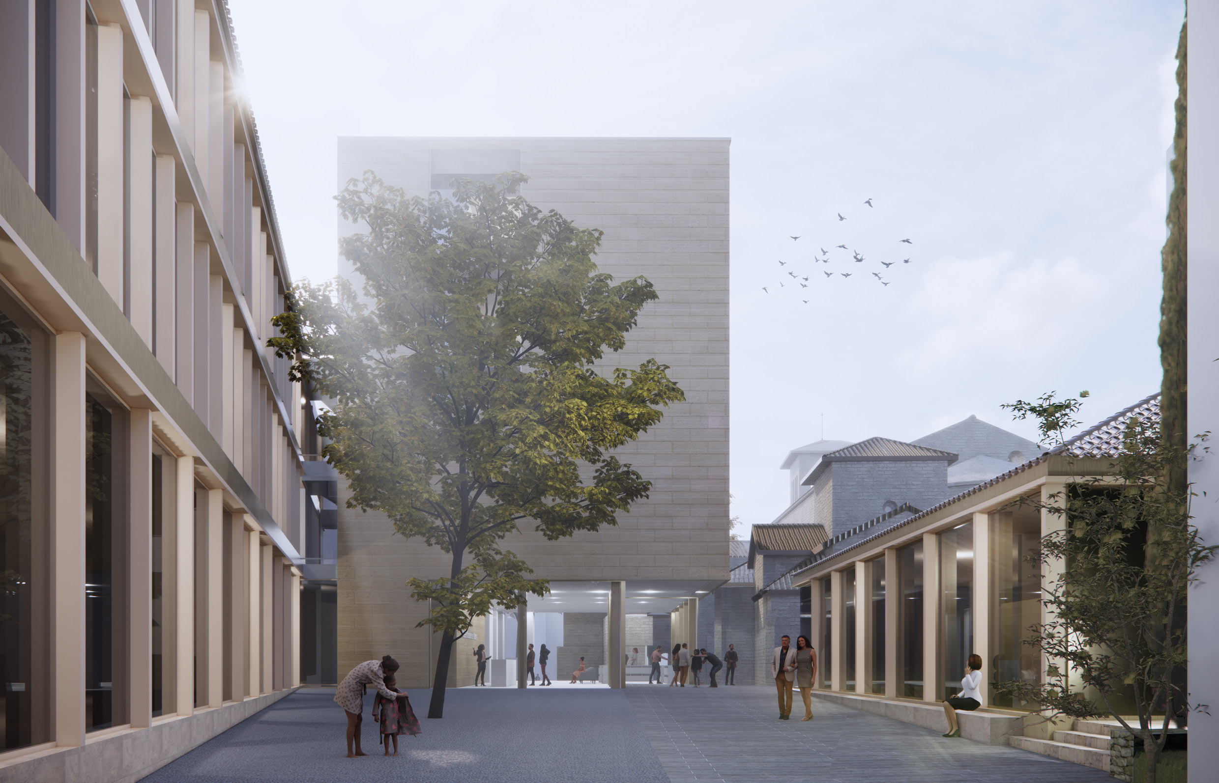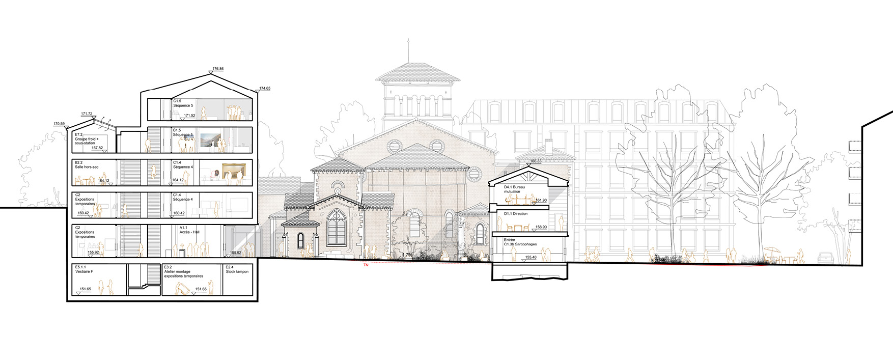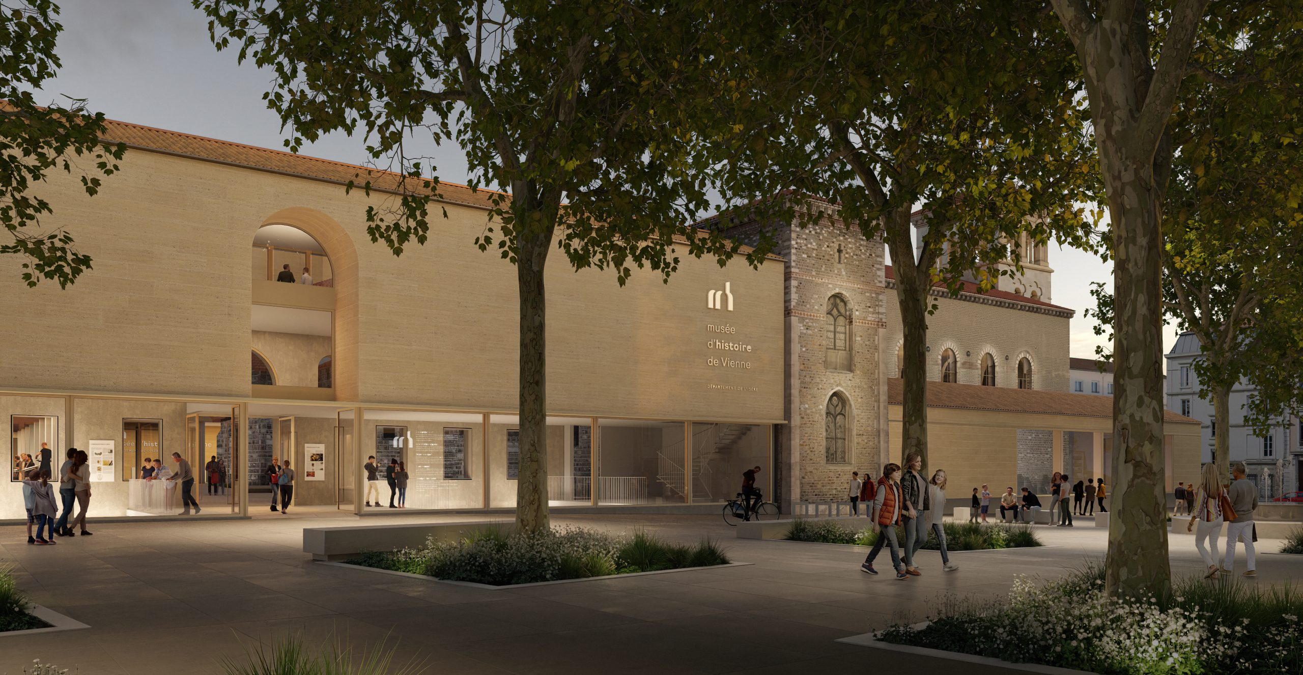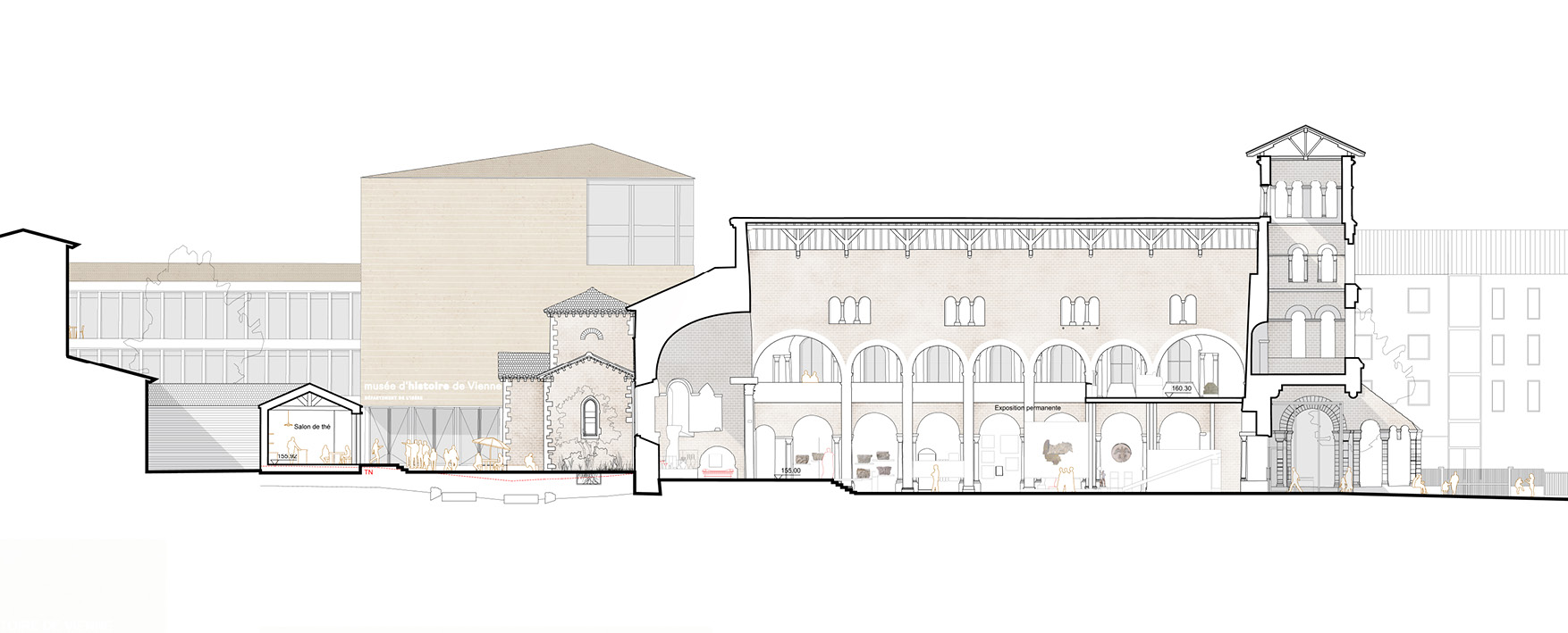 Le projet respecte les échelles du tissu environnant notamment pour les habitations à l’Est du site. L’idée est de conserver ce rapport de proximité entre tissu d’habitat et l’intériorité du musée : Créer un musée en ville à l’échelle de la ville. Les constructions neuves sont relativement basses, allant de RDC à R+2, à l’exception d’un «pavillon émergeant», au centre du cœur d’ilot, où se trouvent le hall d’accueil, sa billetterie et la boutique, mais également l’entrée des expositions permanentes et temporaires. Cette construction neuve, nous rappelle que ce musée sera la porte d’entrée des autres musées départementaux et le rend lisible sur le territoire de Vienne.