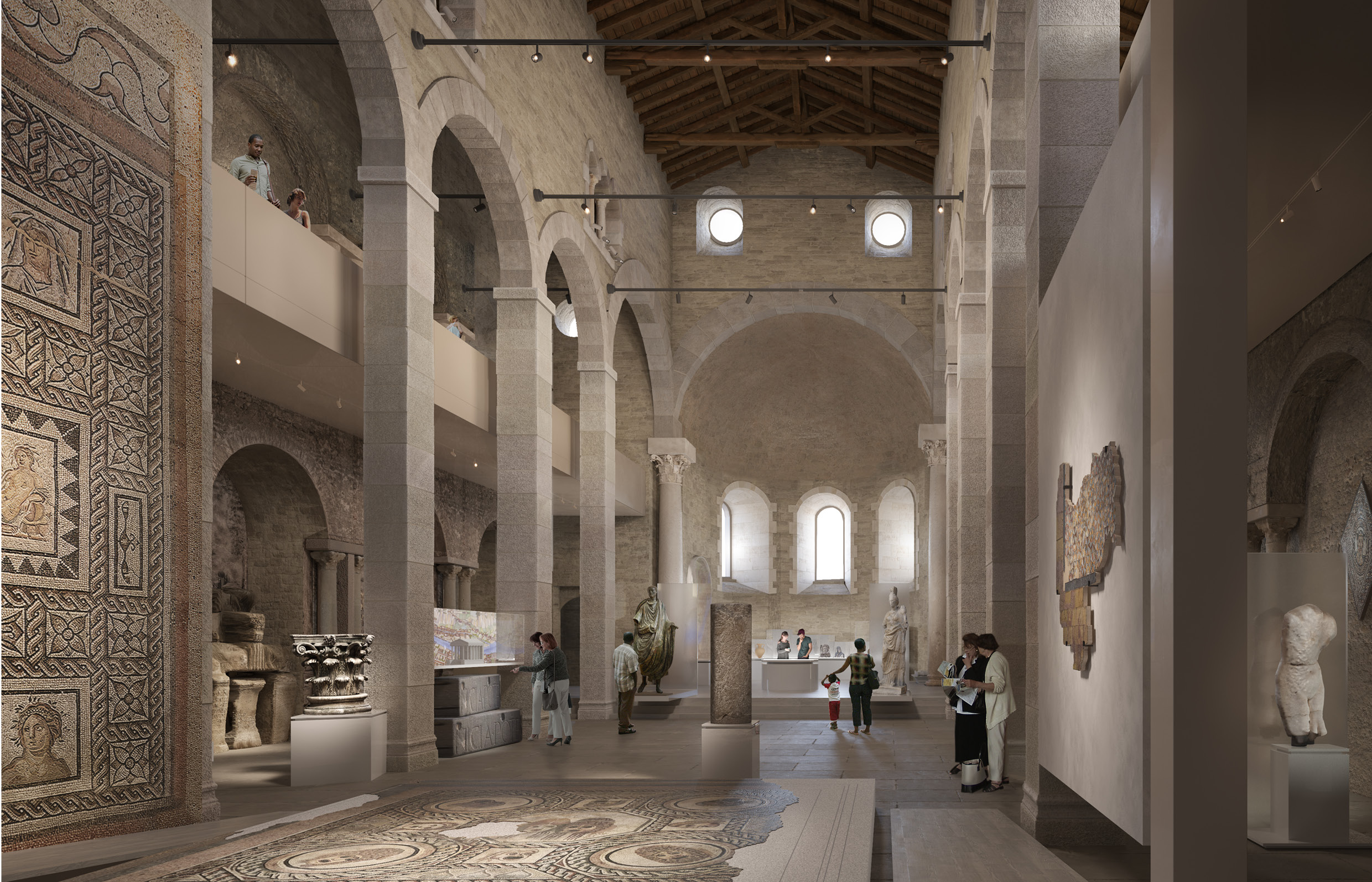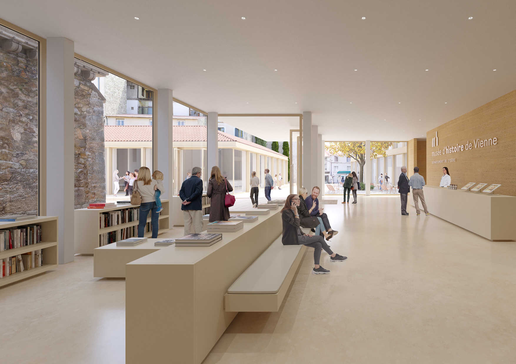 Le hall d’accueil est volontairement mis au cœur du système, pour mettre en scène les monuments historiques. Les jardins sont capables d’accueillir des groupes de personnes répondant aux ambitions du département concernant l’afflux des visiteurs portés à 100 000 visiteurs mais pourquoi ne pas envisager d’autres types de d’activité sur le site : un cinéma en plein air ? des expositions temporaires extérieures ? On peut également imaginer que lors des jours de marché de la ville de Vienne, les jardins permettraient de recevoir le public du musée sans perturber les flux liés au marché.