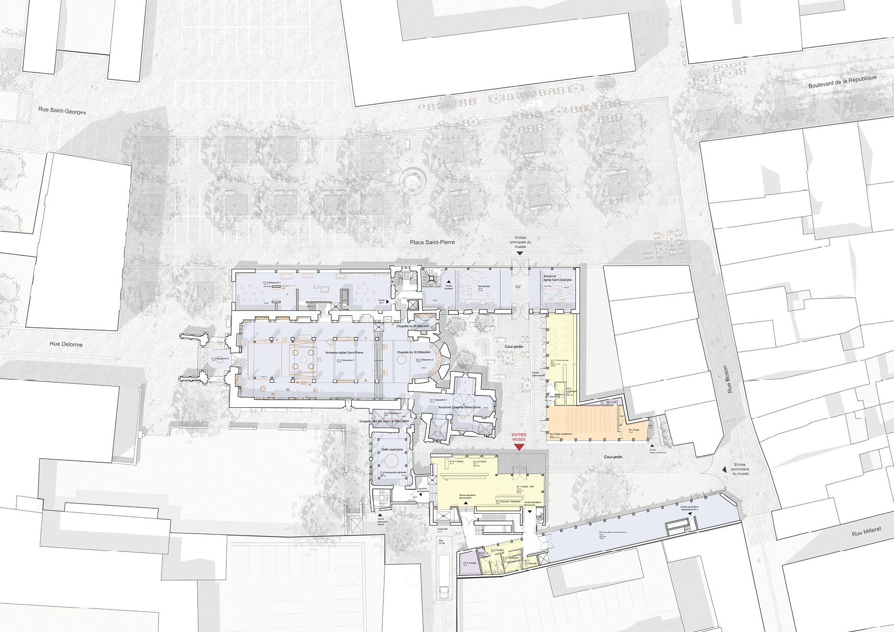 Le projet se développe autour d’une idée de « cour-jardin » reliant la Place St Pierre à la rue Boson. Les deux jardins, le jardin Saint Pierre et le jardin de la cour Boullu, pourraient être potentiellement accessibles librement au public pour donner à voir cet ensemble patrimonial mais également créer des lieux de vie, prolongeant ceux de l’espace public. Ainsi le public est invité à rentrer depuis la place Saint Pierre dans l’enceinte du site pour accéder à différents programmes : le salon de thé, la salle de conférence, la billetterie et la boutique du musée d’histoire de la ville de Vienne.
