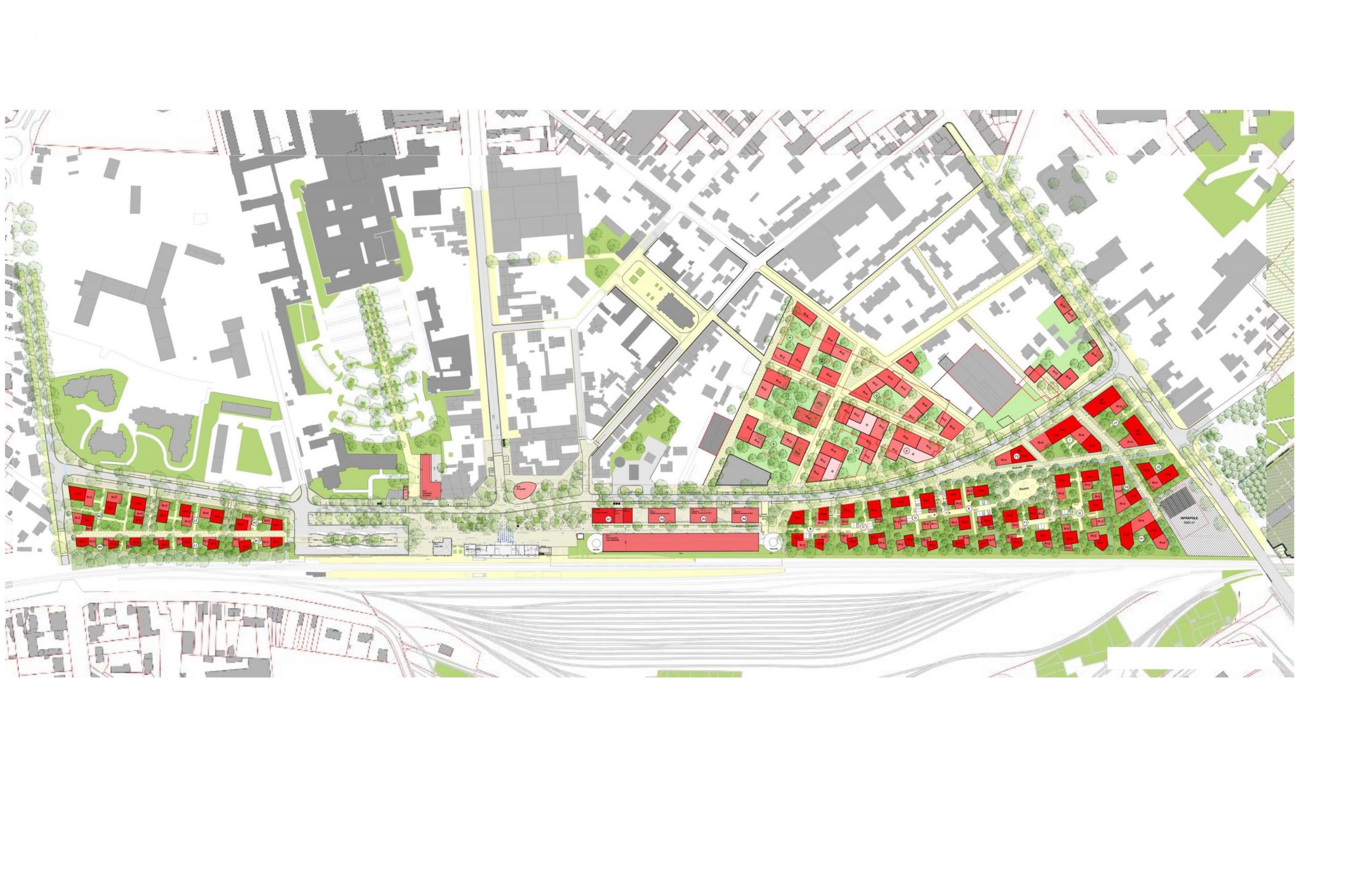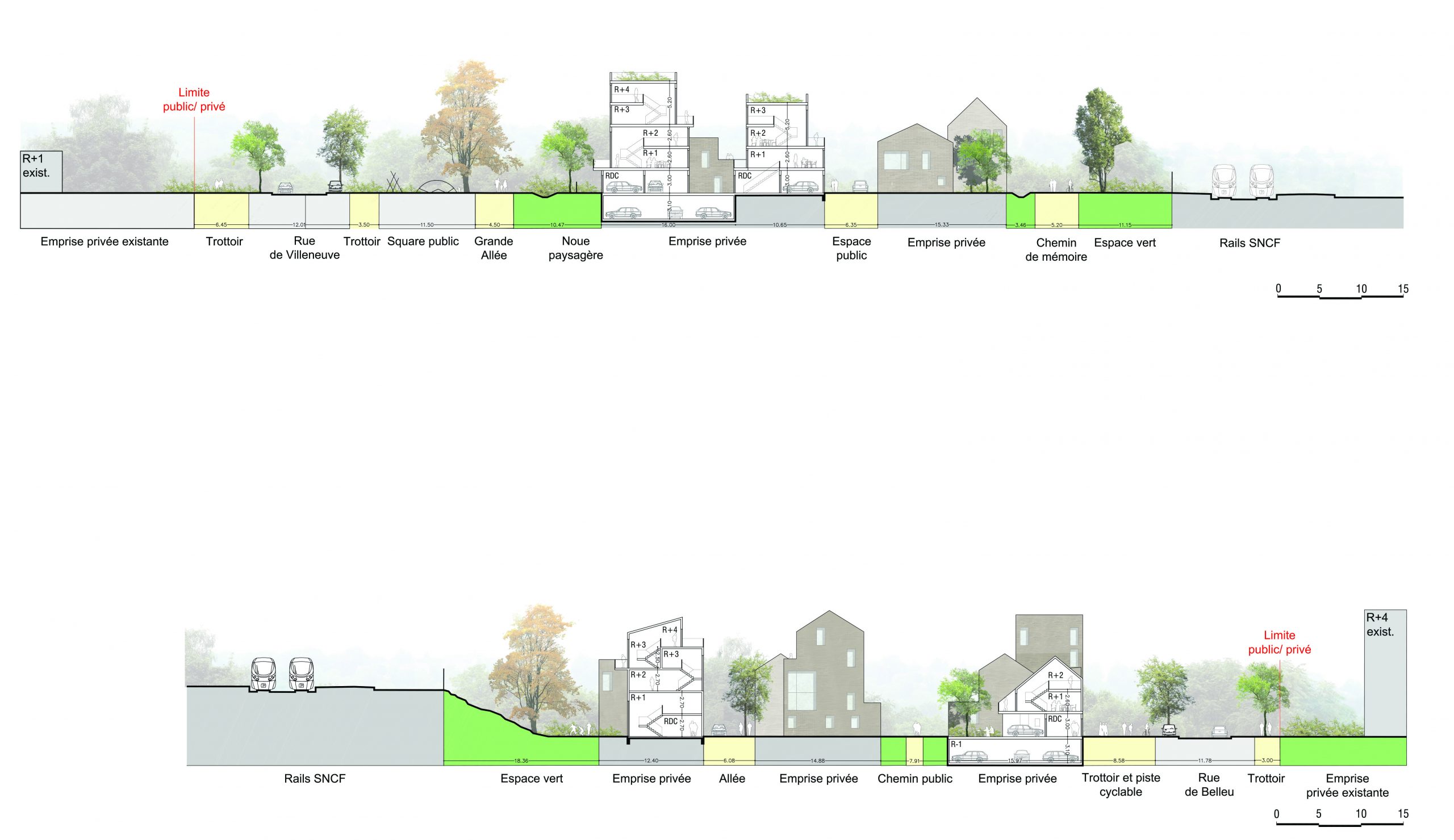 Face à la configuration étroite du site et au rapport linéaire aux voies, il faut développer des typologies d’habitats qui assument une certaine introversion tout en répondant aux besoins d’adaptation des futurs habitants. La construction d’un « paysage urbain » est alors possible qui s’organise à partir de l’hôtel, associé à la halle de la SERNAM transformée. Ailleurs, le quartier se développe entre «cours et jardins ». Les immeubles sont plutôt bas, R+3 moyen. Assumant une certaine permanence, les architectures empruntent aux modèles locaux : toits à deux ou quatre pentes, murs de clôture, lucarnes, briques…