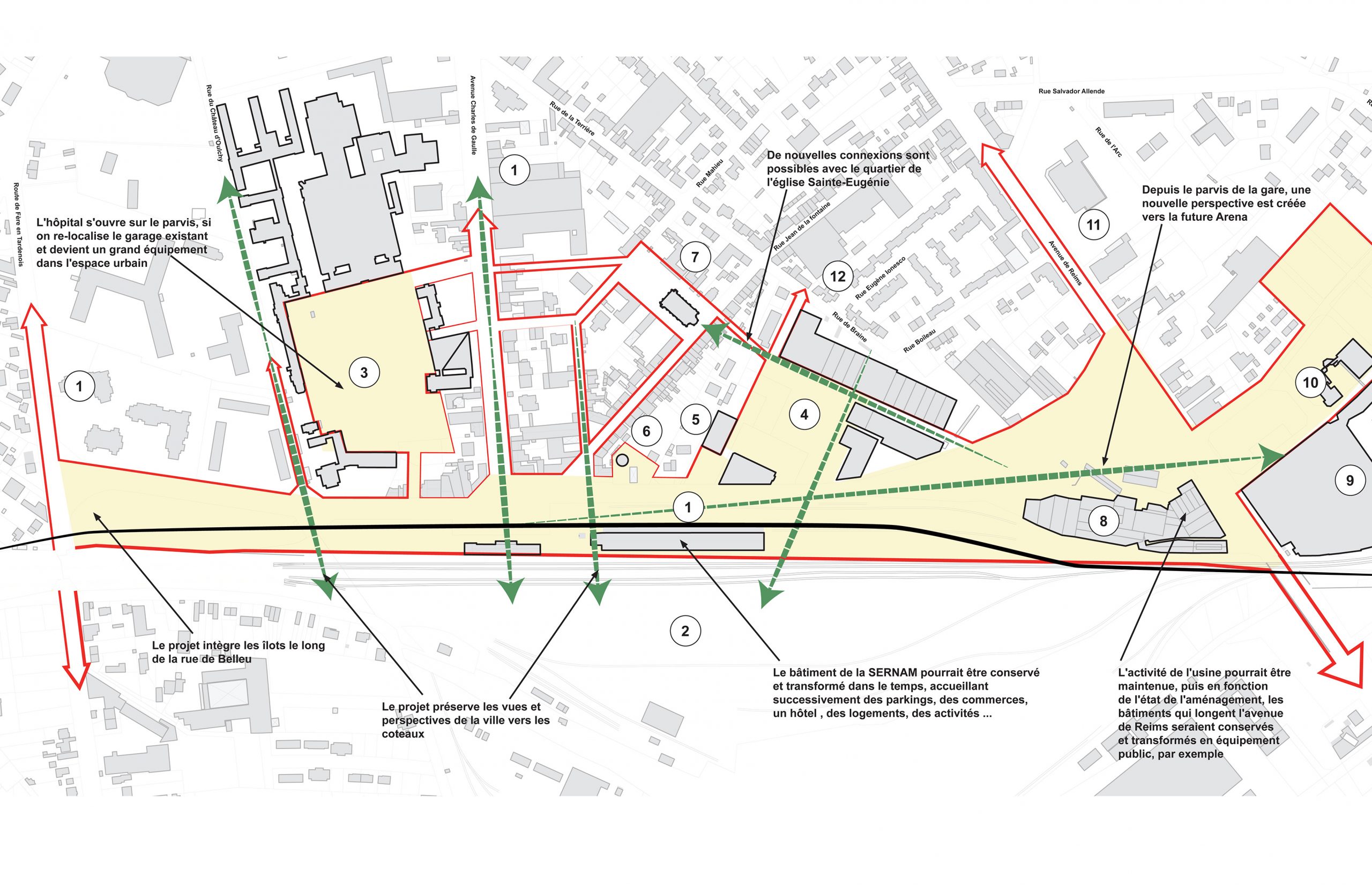 Autour de la gare, la ville a connu un développement marqué par l’industrie : celle-ci a ignoré la géographie et surtout ce rapport à la nature qui reste un des atouts majeurs de cette agglomération située au cœur de la vallée de l’Aisne. Le projet commence par initier un paysage : faire revenir la nature dans cette partie de la ville prépare le terrain à de nouvelles aménités. Cette friche permettrait d’organiser une première dépollution par traitement biologique et faciliterait la bio-régénération. La nature reprenant ses droits, le temps faisant son œuvre, un paysage s’organise progressivement qui s’appuie sur les caractéristiques de cette vallée de l’Aisne.