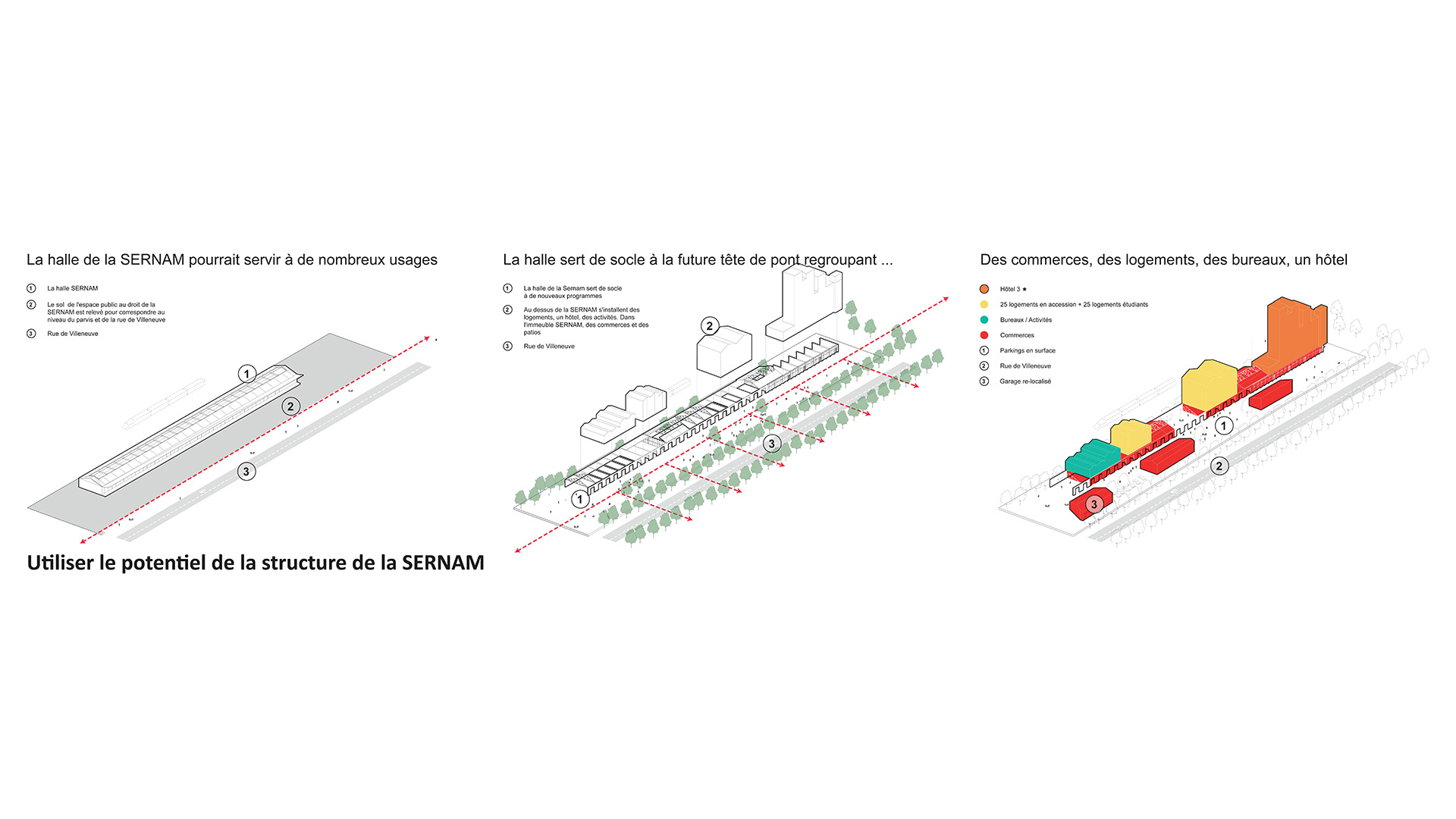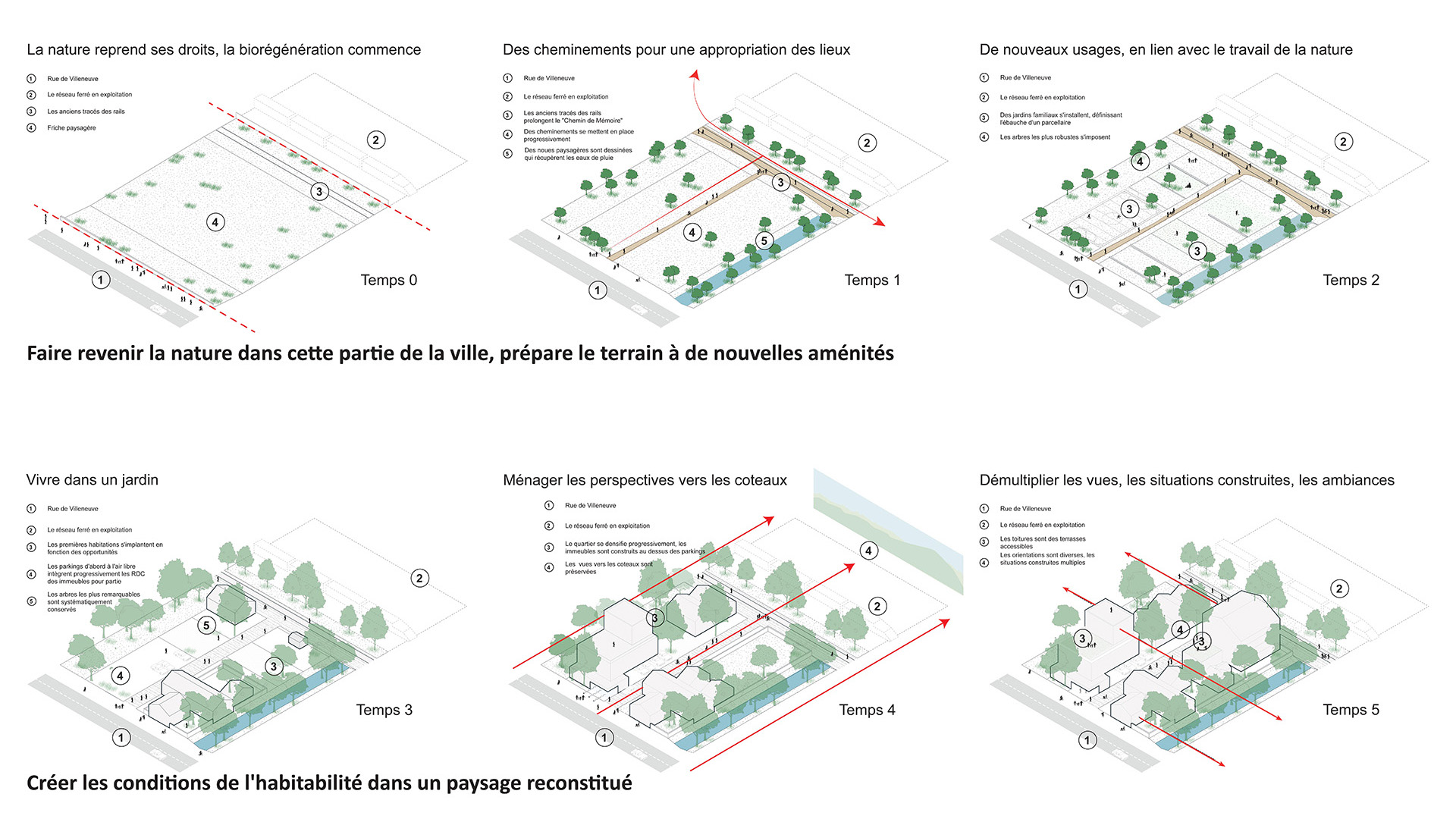 Les constructions à venir s’implanteraient en fonction des opportunités foncières, dans une grande diversité formelle et architecturale, à partir des éléments du paysage déjà constitués : avec des surfaces intérieures généreuses, associées à des prolongements extérieurs confortables, appropriables, en habitant les toits et en multipliant les orientations, imaginant toutes les superpositions possibles et les combinaisons des fonctions, au sein d’un même ilot, pour favoriser la diversité des modes de vie et créer un quartier intégré à la ville, son paysage.