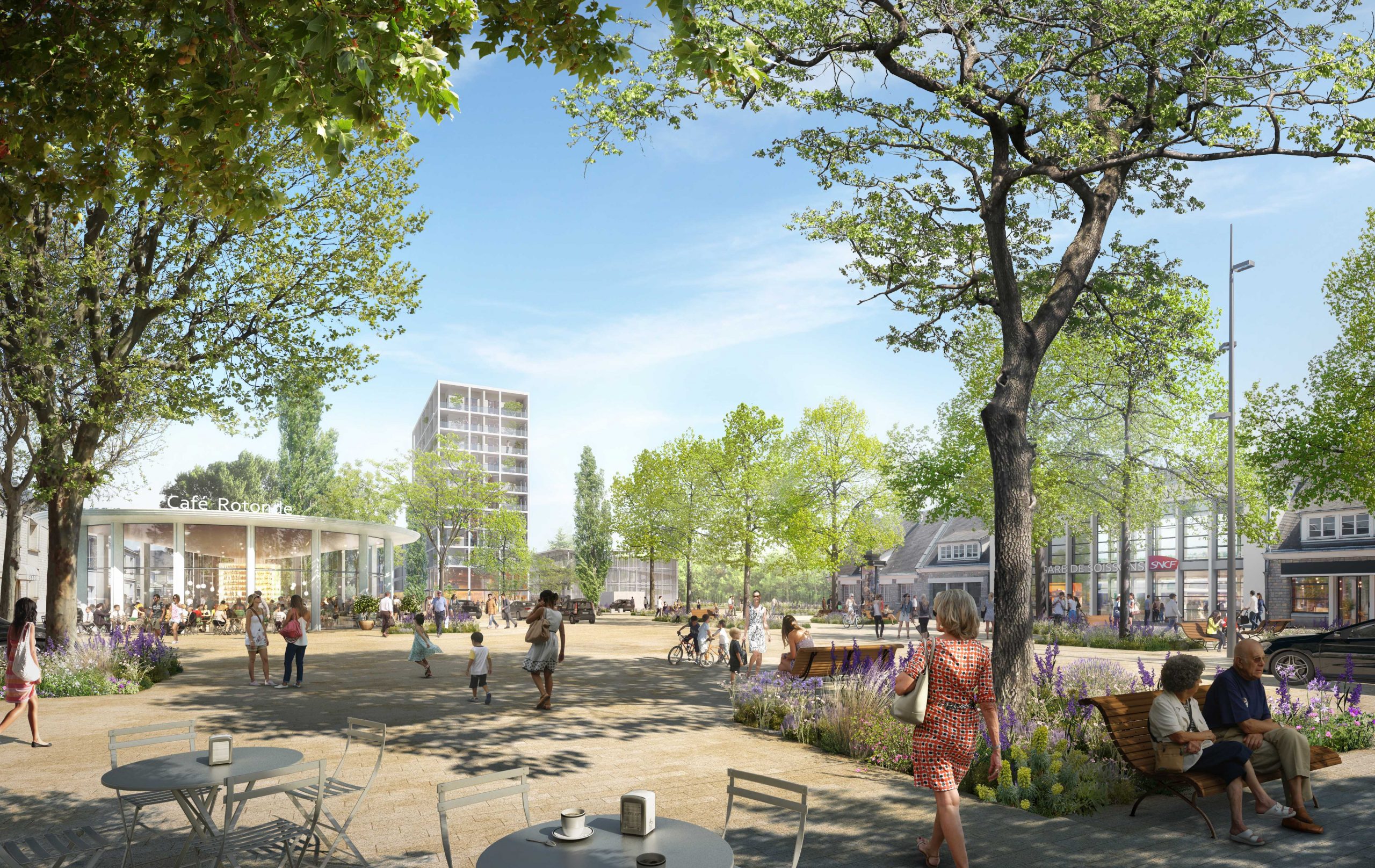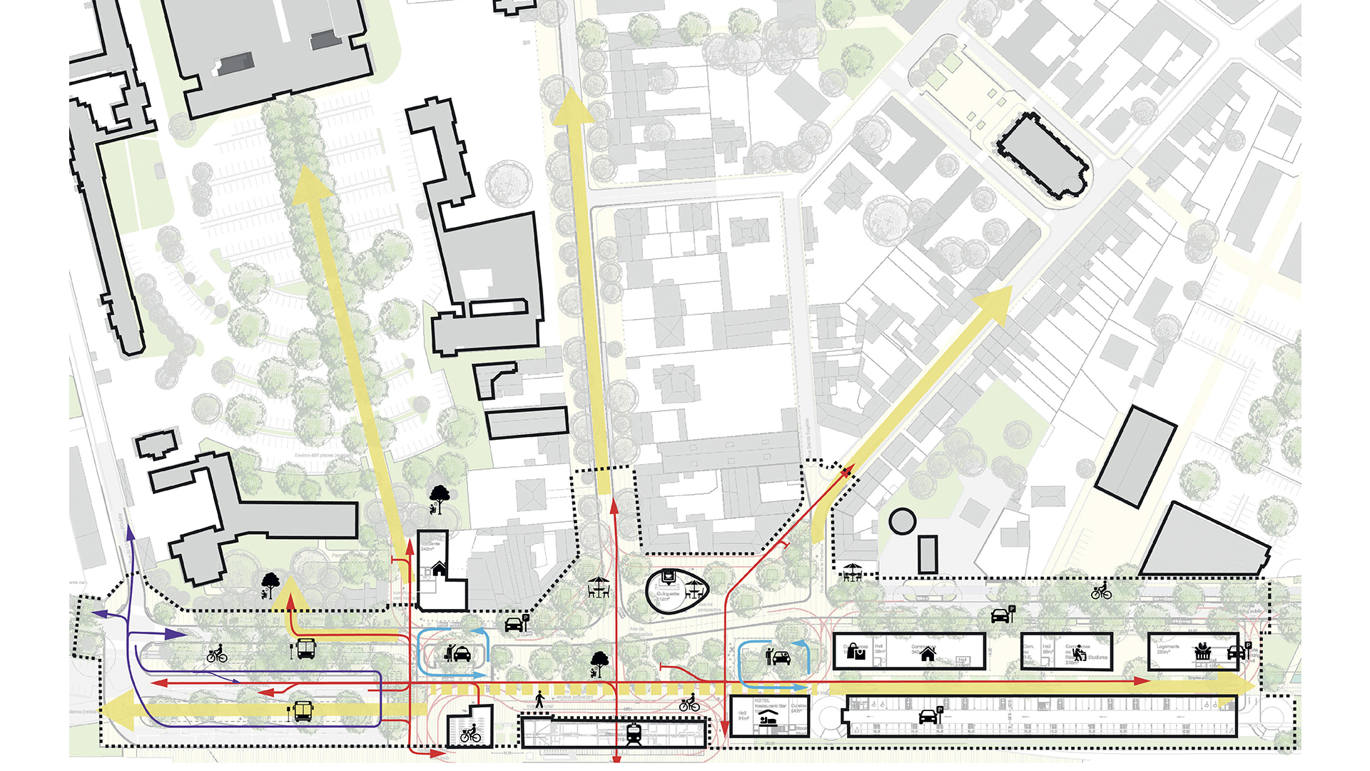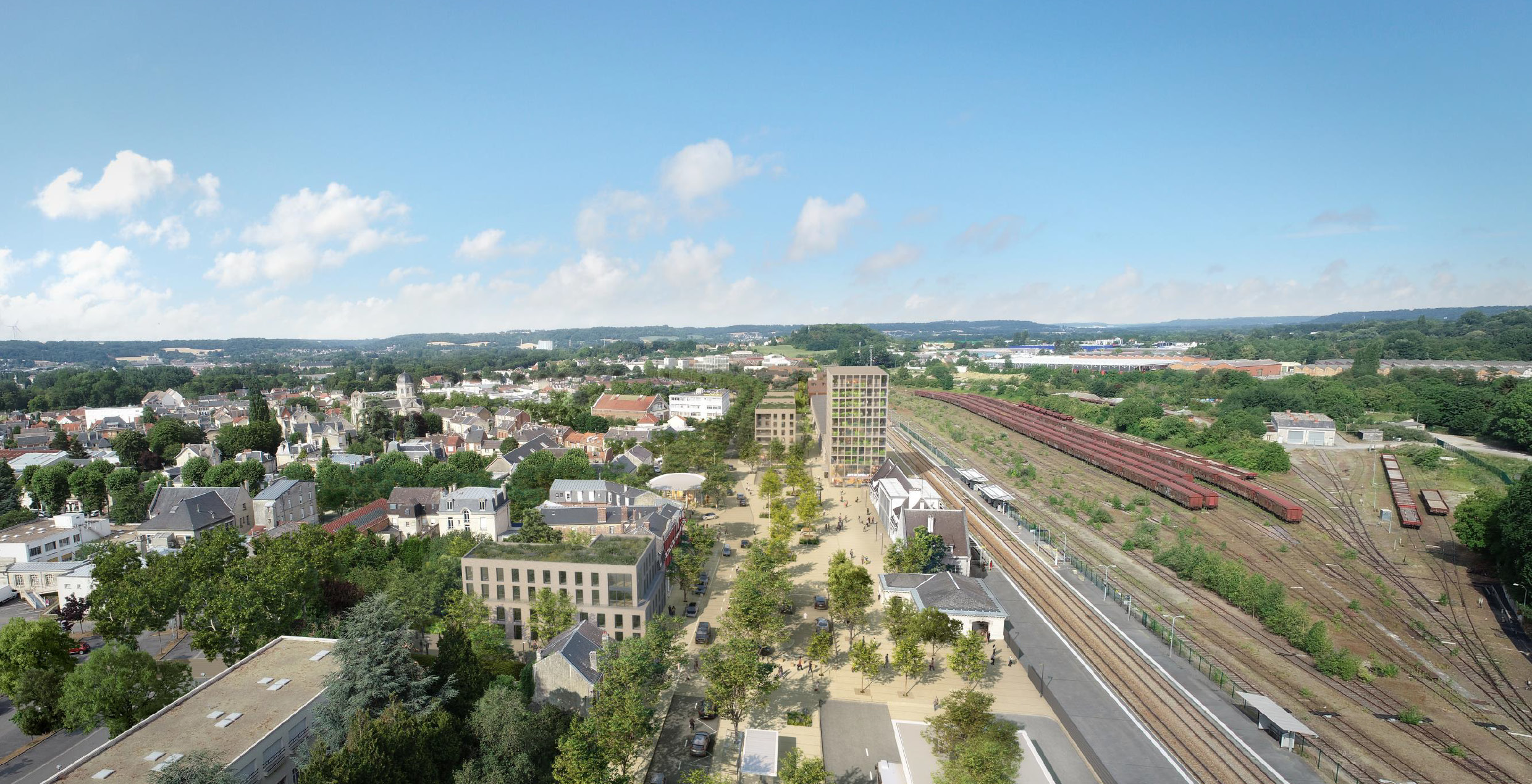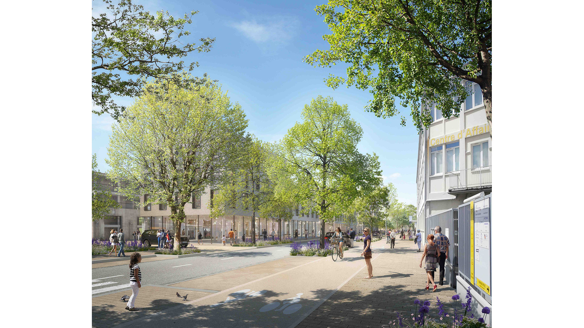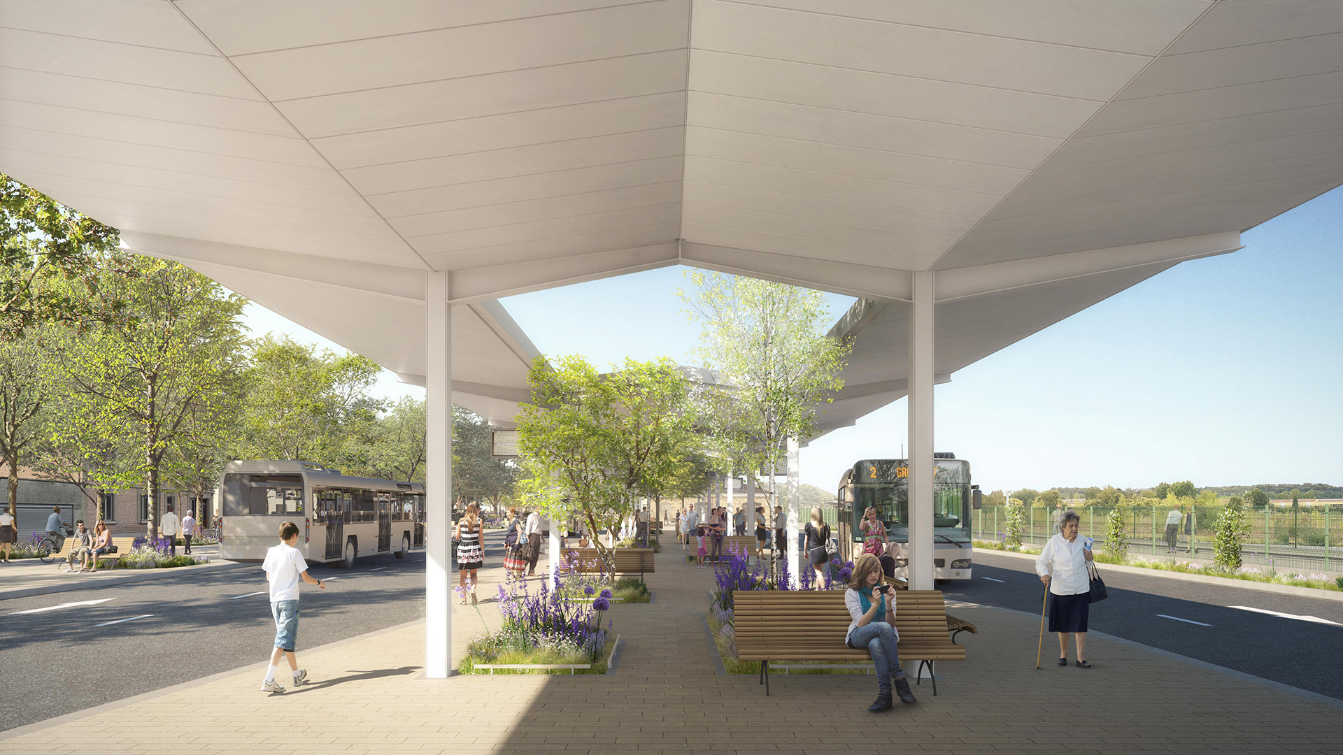 Autour de la gare, le pôle multimodal et le parvis recomposent un espace public cohérent, dotant celle-ci d’une vraie place. Un axe piéton propose une relation claire avec la future Arena et ménage une perspective depuis le parvis, vers cet équipement.